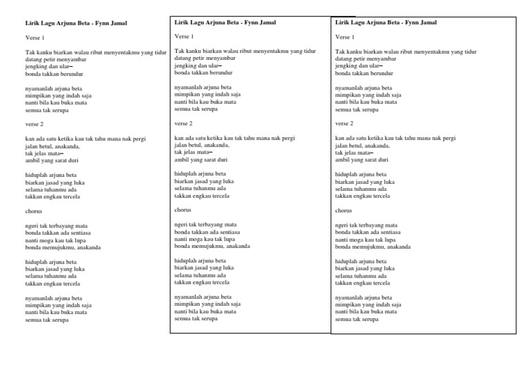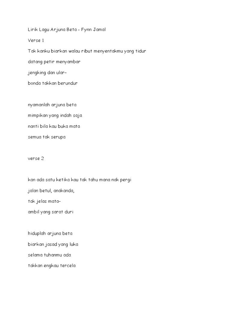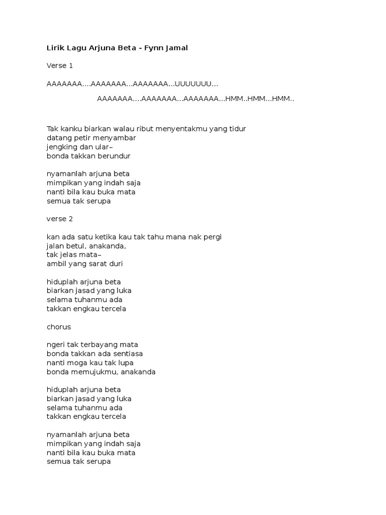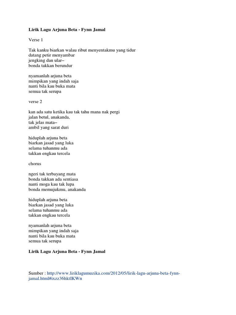 Nyamanlah arjuna beta mimpikan yang indah saja nanti bila kau buka mata semua tak serupa verse 2 kan ada satu ketika kau tak tahu mana nak pergi jalan betul anakanda tak jelas mata ambil yang sarat duri hiduplah arjuna beta biarkan jasad yang luka selama tuhanmu ada takkan engkau tercela chorus ngeri tak terbayang mata bonda takkan ada. Ketika lirik lagu ini digubahÃÂ FynnÃÂ Arjuna sedang bergelut denganÃÂ sakit jantung pada usia seawal 1 bulan. Lirik Lagu Arjuna Beta.